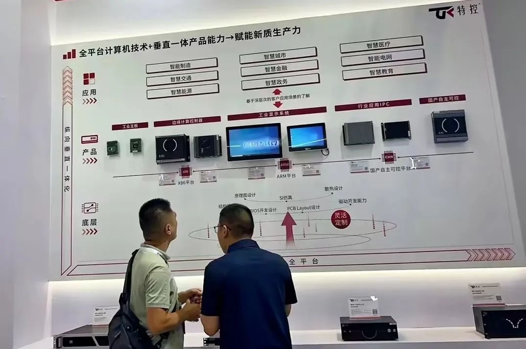 此次工博會,特控也緊扣“工業聚能 新質領航”的主題,通過橫向的全場景計算機技術解決方案與縱向的垂直一體化服務賦能新質生產力。橫向方面,根據客戶的應用場景,基于全平臺的計算機技術:X86架構、ARM架構、國產化平臺進行產品研發;縱向方面,擁有從板卡到整機系統的完全自主研發和靈活定制能力,包括原理圖設計、PCB Layout設計、散熱設計、結構設計、SI仿真、BIOS開發設計和驅動開發能力等,為客戶產品質量和品牌提供保障,幫助客戶在最短時間把產品推向市場。